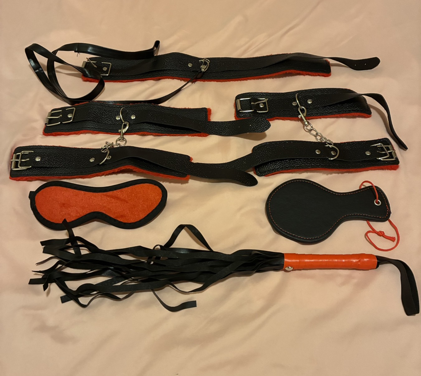 『ソフトSM用グッズ(首輪,手枷,足枷,目隠し,バラ鞭,パドル)』